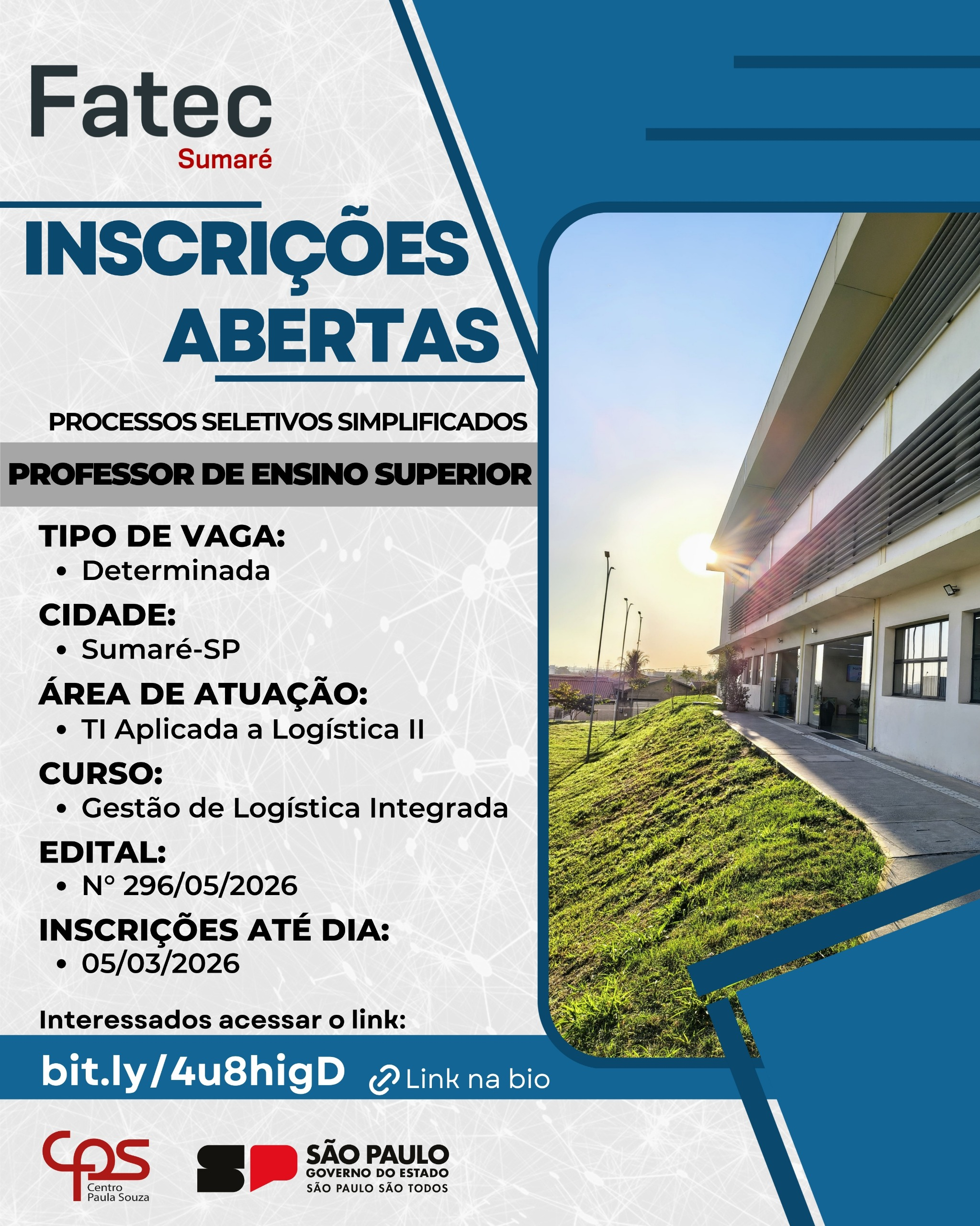 A Fatec Sumaré está com inscrições abertas para Processos Seletivos Simplificados destinados à contratação de Professor de Ensino Superior (vaga determinada).