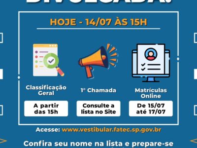 A classificação geral e a 1ª chamada do Vestibular da Fatec Sumaré estarão disponíveis a partir de 14/07 às 15h no site:👉 www.vestibular.fatec.sp.gov.br 📢 Confira se o seu nome está na lista e se prepare […]