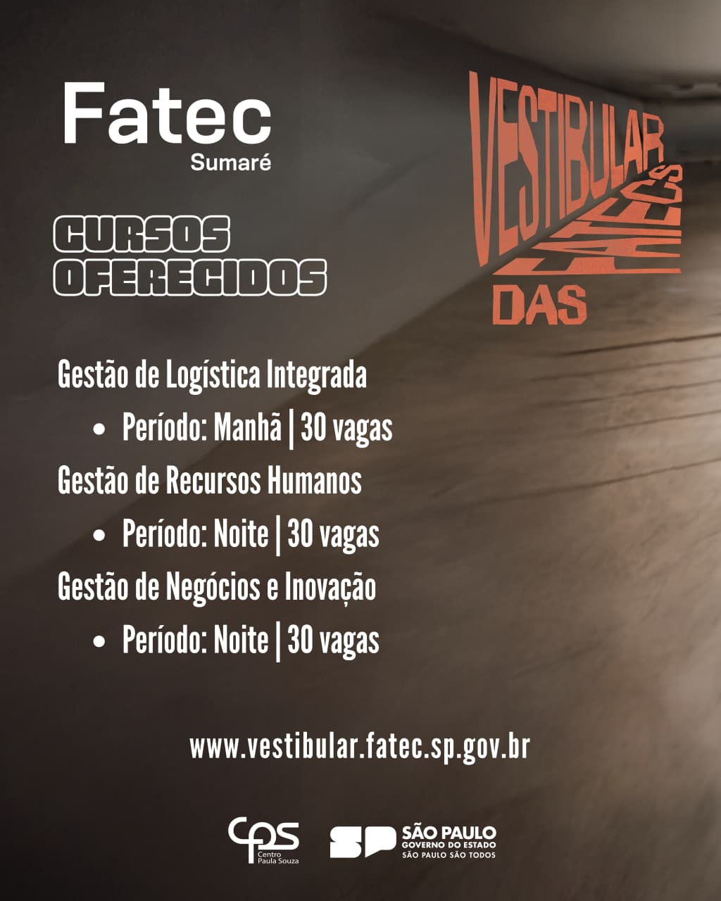 🚨Inscrições abertas para o Vestibular da Fatec Sumaré – 2º semestre de 2026.🚨